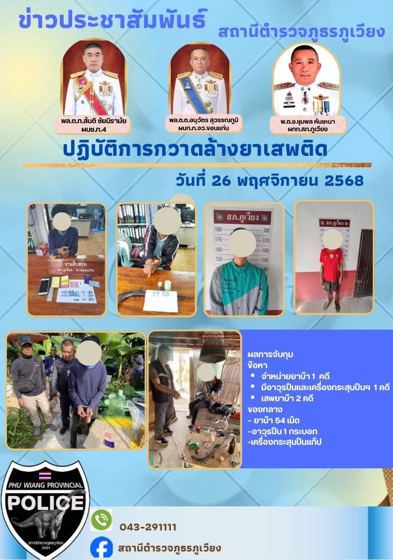 สภ.ภูเวียง ขอรายงานผลการปฏิบัติในการจับกุม วันที่ ๔ พฤษภาคม ๒๕๖๘ โดยการ อำนวยการสั่งการของ พ.ต.อ.ชุม