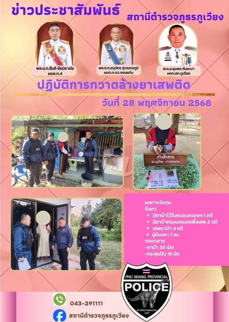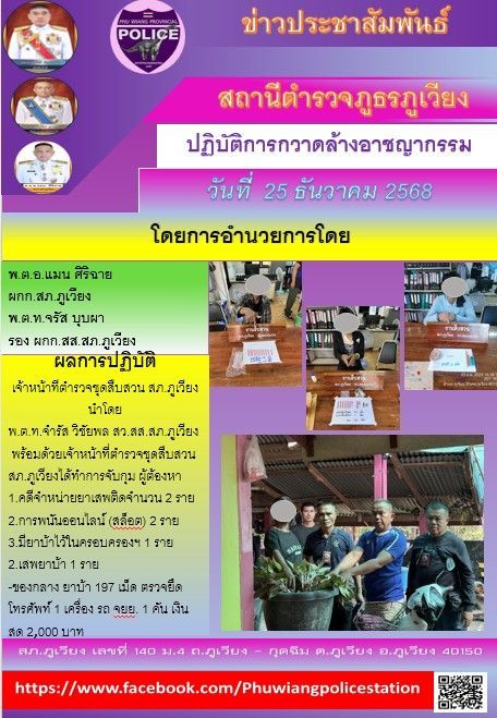 สภ.ภูเวียง ขอรายงานผลการปฏิบัติในการจับกุม วันที่ ๖ มิถุนายน ๒๕๖๘โดยการอำนวยการของ นางสุวรรณา วรรณศร