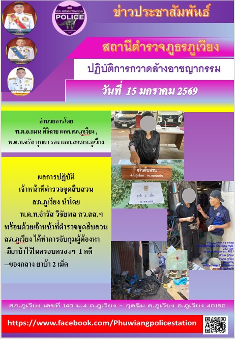 วันนี้ 14 มกราคม 2569 เวลา 14.00 น. โดยการอำนวยการของ 🔷 พ.ต.อ แมน ศิริฉาย ผกก.สภ.ภูเวียง 🔷 พ.ต.ท.ประ