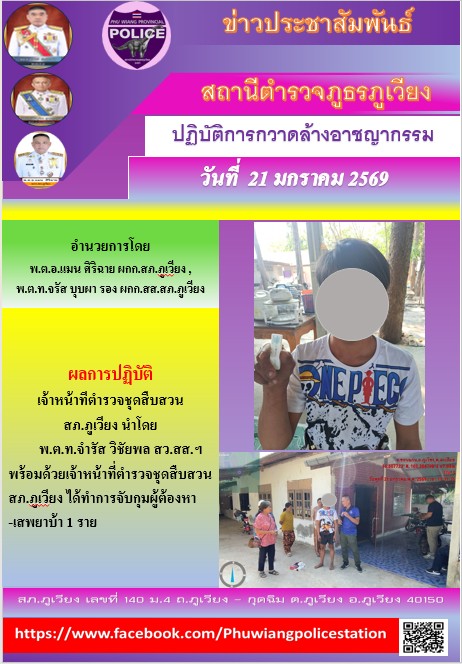 วันนี้ (21 ม.ค.69) เวลา 13.30 น. พ.ต.อ.แมน ศิริฉาย ผกก.สภ.ภูเวียง พร้อมด้วย พ.ต.ท.คะนอง ภูบาลชื่น รอ
