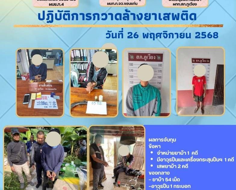 สถานที่จับกุม ที่กระท่อมไม่มีเลขที่ทิศใต้บ้านหนองบอน หมู่ที่ ๙ ต.หนองกุงธนสาร อ.ภูเวียง จ.ขอนแก่น