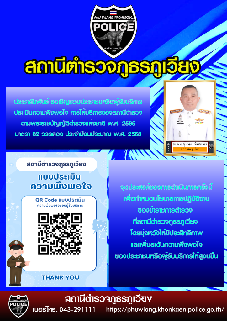 สถานีตำรวจภูธรภูเวียงขอประชาสัมพันธ์ ขอเชิญชวนประชาชนหรือผู้รับบริการ ประเมินความพึงพอใจ การให้บริการขอสถานีตำรวจ ตามพระราชบัญญัติตำรวจแห่งชาติ พ.ศ. 2565 มาตรา 82 วรรคสอง ประจำปีงปประมาณ พ.ศ. 2568