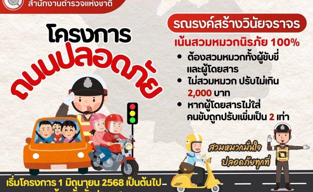 ตร.เข้ม “โครงการถนนปลอดภัย” บังคับใช้กฎหมายป้องกันอุบัติเหตุ “คนขับ-คนซ้อน” ต้องสวมหมวกกันน็อก คิกออฟ 1 มิ.ย.ทั่วประเทศ หากฝ่าฝืนมีโทษปรับ 2 พัน และอาจมีโทษปรับเป็น 2 เท่า